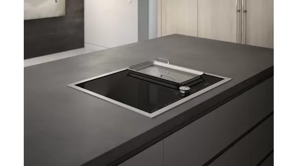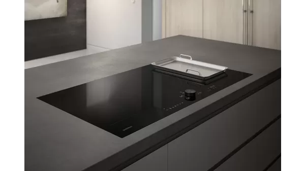 - Две прямоугольные конфорки, расположенные рядом друг с другом, объединяются в единое пространство с помощью функции Flex induction.